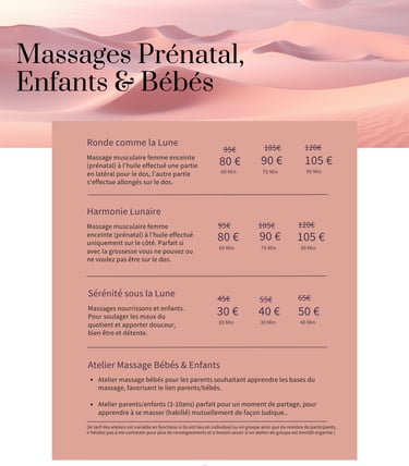 Tarif valable pour massage à domicile dans un rayon de 15/20km de Draveil. En dehors de ce périmètre des frais kilométriques pourront être ajoutés. N'hésitez pas à me contacter pour plus de détails.